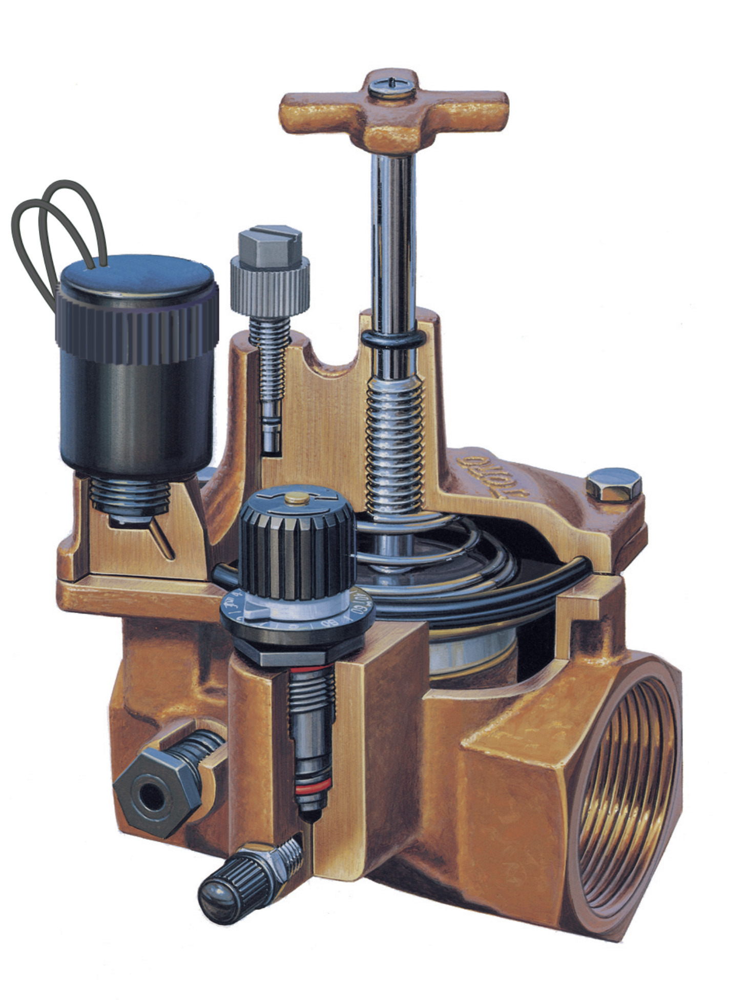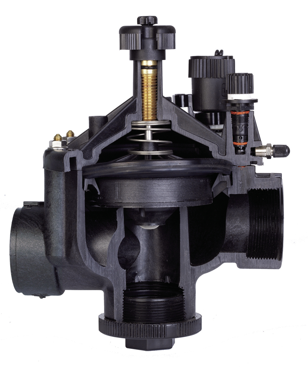 Электроклапаны используются для пуска спринклеров работающих не по принципу электро-импульса а по принципу гидравлического напора воды. В конструкции полива для гольфа, применяется для полива, чаще всего, «Тee» зон. Выпускаются в пластиковом и латунном варианте.