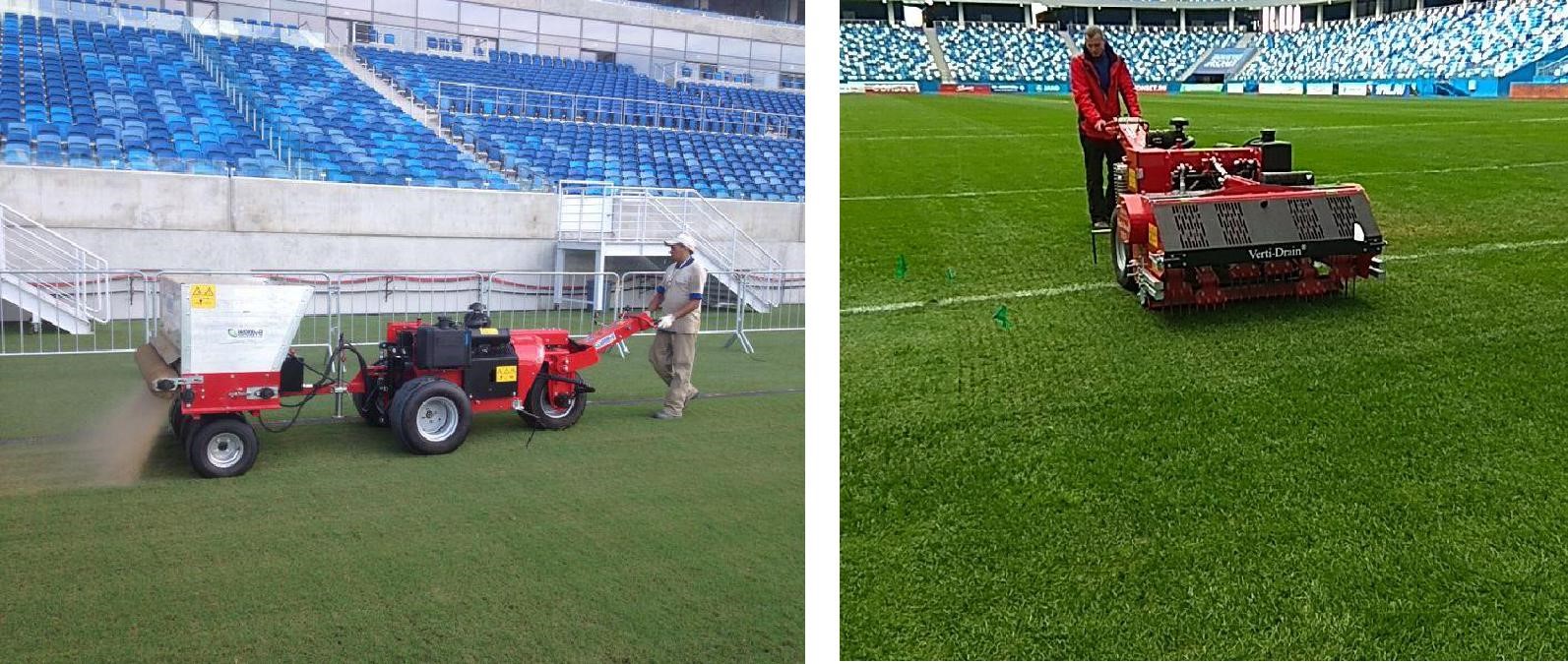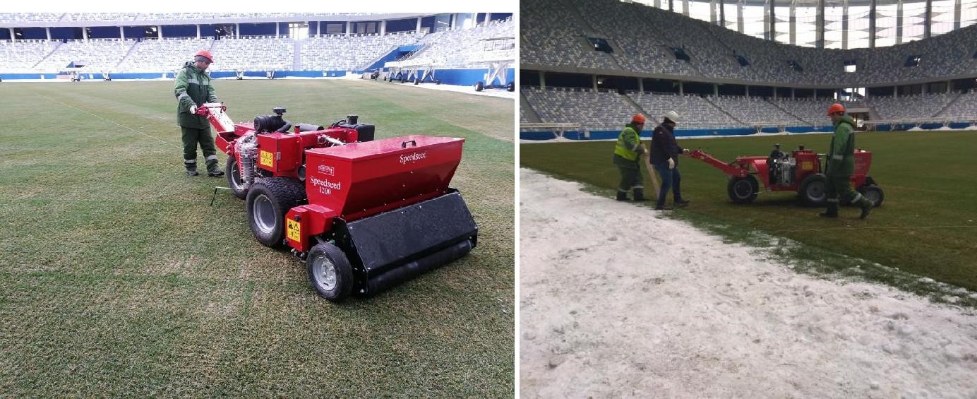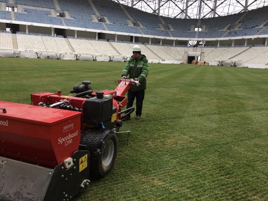 Агроном Роман Жуков на стадионе в Нижнем Новгороде комбинирует свою технику для обслуживания с тягачом Carrier Redexim, чтобы исключить давление на газон оказываемое обычным трактором. Его игровое поле особенно мягкое и чувствительно после зимы, когда почва мягкая и следы от шин трактора наиболее видны, что приводит к возникновению неровностей на поверхности. Тем не менее, именно подсев необходим для создания полноценного травяного покрытия. Сеялка для газона Speed-Seed (модель 1200) использовалась весной три раза, чтобы посеять семена в тысячах крошечных отверстий, непосредственно в почву, обеспечивая их быстрое прорастание. А благодаря использованию сеялки с легковесным тягачом Carrier Redexim на широких колесах, давление на грунт и воздействие на газон было минимальным.