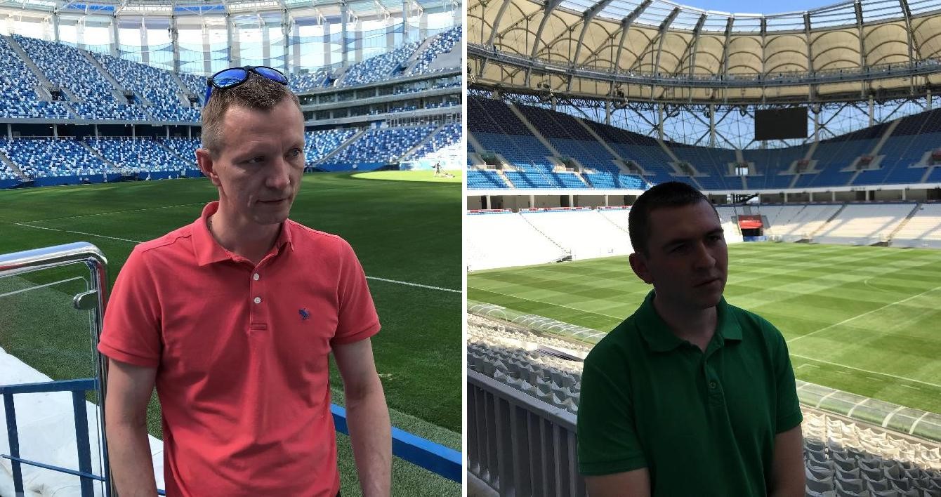 Стадион Нижний Новгород – главный агроном Роман Жуков (слева) и стадион Волгоград – главный агроном Владимир Проскуряков (справа); оба поля построены с использованием техники гибридного покрытии марки Desso Grassmaster.