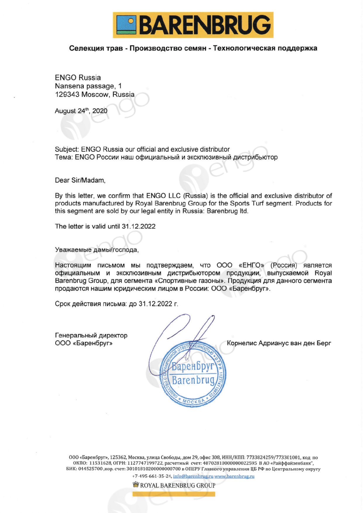 Мы рады Вам сообщить, что компания «ЕНГО» Россия, продлила до декабря 2022 года соглашение с компанией Barenbrug об официальном и эксклюзивном дистрибьютерстве продукции, выпускаемой Royal Barenbrug Group в линейке «Спортивные газоны».
