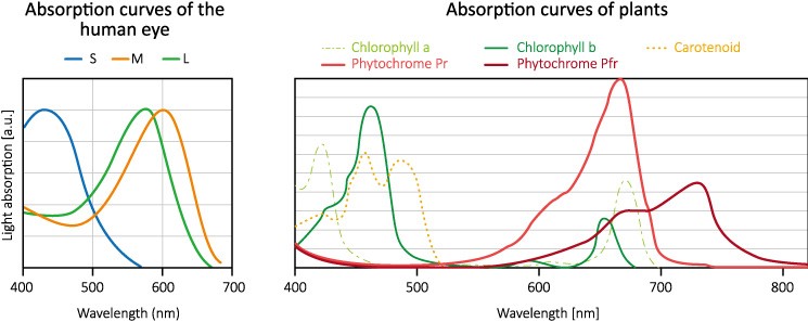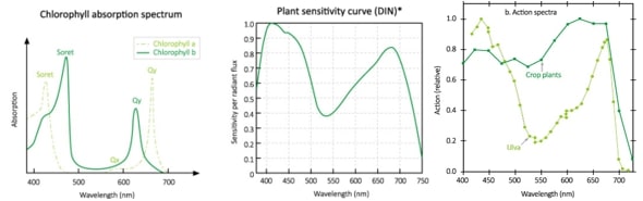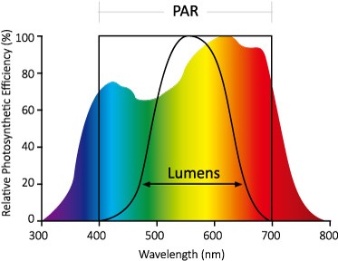 ФАР (Фотосинтетически Активная Радиация) – это НЕ единица измерения или “метрика”, как футы, дюймы или килограммы. Это, скорее, часть диапазона в спектре света, при котором фотосинтез у растений происходит наиболее эффективно. Посредством фотосинтеза растения преобразуют световую энергию в химическую, которая их питает, и способствует росту. В растениях свет в основном взаимодействует с Хлорофиллами a и b. ФАР находится в диапазоне длин волн от 400 нм до 700 нм. В зоне ФАР мы измеряем свет, падающий на растения, который выражается как ПФФП или Плотность Фотосинтетического Фотонного Потока – в микромолях на метр в секунду (мкмоль/м²×с). Больше об этом параметре читайте ниже. Ранее уровень освещения в теплицах измеряли в Люксах. Люкс или Люмен – это единица измерения света воспринимаемого человеческими глазами, которые реагируют на дневной (или видимый) свет. Наши глаза имеют три рецептора для света: S, M и L рецепторы, которые реагируют в основном на синий, зелёный и жёлтый свет. График, в котором отображены диапазоны люмен и ФАР, показан выше – как вы можете видеть, начальная и конечная точки почти совпадают с зоной ФАР, а в области синего и красного света наблюдаются расхождения, поскольку мы оцениваем использование света растениями. Приведённая выше иллюстрация показывает разницу между светочувствительностью человеческих глаз и светочувствительностью растений. Поскольку производство хлорофилла растениями наиболее эффективно с помощью фотонов синего и красного света, то не совсем правильно измерять уровни освещённости светодиодных фитоламп в люксах, как это делали раньше. Поэтому новый показатель выражается в микромолях на метр в секунду и включает в себя все световые фотоны в диапазоне от 400 до 700 нанометров. Фотосинтетический Поток Фотонов (ФПФ) ФПФ или Фотосинтетический Поток Фотонов – это общее количество света в зоне ФАР, которое производится источником света каждую секунду. Таким образом, ФПФ измеряет “фотосинтетически активные фотоны, излучаемые системой освещения в секунду”. Измеряется в мкмоль/сек. С помощью показателя ФПФ фитолампы вы можете рассчитать или оценить, сколько ламп вам понадобится на единицу площади, чтобы достичь необходимого уровня освещения растений. Возьмём в качестве примера производителя клубники, который планирует зимнее выращивание с уровнем освещённости 200 мкмоль/см². При размещении светильников на высоте 8 метров и расстоянии между ними 5 метров каждая зона выращивания составит 40 м². Таким образом, нам потребуется в общей сложности 40м² х 200 мкмоль/см² = 8000 мкмоль света для этой площади. Если одна светодиодная фитолампа производит ФПФ 2000 мкмоль/с, то потребуется 4 лампы на зону выращивания. ФПФ не указывает, сколько измеренного света на самом деле попадает на растения или любую другую поверхность. Поэтому имейте в виду, что не каждая лампа с одним и тем же ФПФ одинаково эффективна в доведении этого света до посевов. К тому же, он не объясняет ничего о спектре света и длине волны этих фотонов. Подробнее об этом вы можете узнать ниже. Является ли текущее измерение ФПФ ФАР реалистичным и актуальным? Сегодня все фотоны во всём спектре измеряются одинаково, что весьма усложняет сравнение их значения для растений. Возьмём, к примеру, ФАР-показатель HPS SON-T из последних поколений – значение ФАР, ко