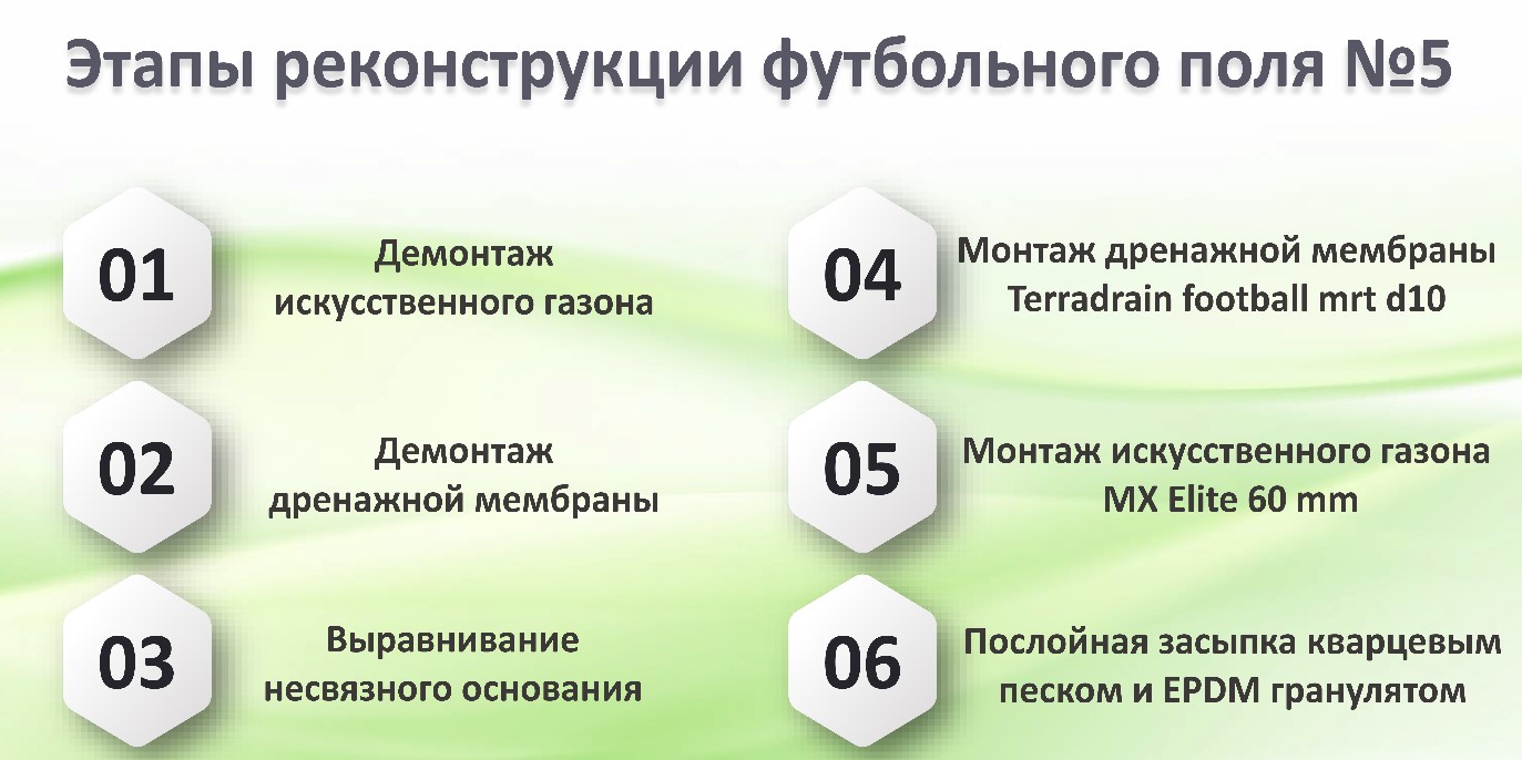 Компания «ЕНГО» Россия завершила реконструкцию тренировочного футбольного поля №5 на академии «Зенит», по адресу: Санкт-Петербург, ул. Верности 21 А. «Академия ФК «Зенит» — футбольная детско-юношеская школа олимпийского резерва, основанная в 1968 года. Является неоднократным победителем и призером соревнований по футболу различного масштаба (в России и за рубежом), а также служит основной базой по подготовке спортивных резервов для «Зенита». Этапы реконструкции футбольного поля №5: 1. Демонтаж искусственного газона по технологии: разрезание по швам склейки, сматывание в рулоны длинной 7м. (Срок работ - 7 дней) 2. Демонтаж дренажной мембраны с последующей утилизацией до 100км. (Срок работ - 3 дня) 3. Выравнивание несвязного основания. Засыпка гранитного отсева фракцией 0-5мм с уплотнением. (Срок работ - 2дня) 4. Укладка на подготовленное основание рулонной дренажной мембраны Terradrain football MRT D10 с герметичным нижним слоем и стыком внахлёст. (Срок работ - 4 дня) 5. Укладка искусственного газона Greenfields MX Elite 60mm, соответствующего требования FIFA Quality и Quality Pro, включая вклейку разметки в соответствии со стандартами. (Срок работ - 8 дней) 6. Послойная засыпка газона кварцевым песком и EPDM гранулятом с вычесыванием искусственного волокна после каждого слоя засыпки. (Срок работ - 6 дней) Общий срок реконструкции тренировочного футбольного поля №5 Футбольной академии «Зенит» составил 30 дней. В ходе реконструкции было применено премиальное плетеное покрытие Greenfields MX Elite, используемое лучшими клубами мира, прекрасно подходящее для скоростной профессиональной игры. MX Elite — это высокотехнологичная плетеная система (технология – Woven) с бескомпромиссными эксплуатационными характеристиками. Запатентованная технология тканой системы обеспечивает чрезвычайно прочное удержание пучков по сравнению с традиционными изделиями, изготовленными методом прошивания (Tufted). Это способствует эффективному выпрямлению нитей (большое сходство с натуральным газоном) и распределению наполнителя, за счет чего обеспечиваются превосходные эксплуатационные свойства покрытия. Одинаковое расстояние между пучками обеспечивает равномерное качение мяча в любом направлении, а более широкие интервалы между нитями способствуют более легкому разуплотнению наполнителя. GreenFields MX Elite имеет наибольшее количество высококачественных нитей в пучке. В покрытии применяются запатентованные нити Evolution®, а также нити ромбовидной и трехлепестковой формы. Это идеальное сочетание нитей обеспечивает натуральный внешний вид и максимальную устойчивость покрытия к нагрузкам. GreenFields MX Elite обеспечивает: Покрытие не только имеет привлекательный внешний вид, оно обеспечивает оптимальные игровые характеристики и отлично справляется с этой задачей.