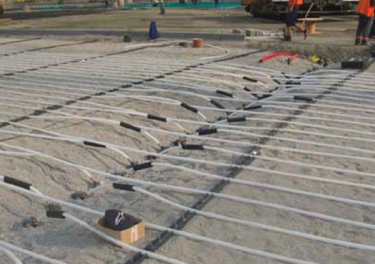 Независимая система на основе труб с медиумом (этиленгликоль) + электрические или газовые котлы, устроена таким образом, что насос гонит этиленгликоль по трубам и нагревает поле; теплообменник: городское тепло (ТЭЦ) нагревает жидкость, а жидкость нагревает медиум.