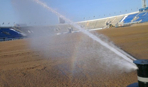 Источниками воды могут быть как городская система водоснабжения, так и скважина спортивного сооружения. Городская вода обладает массой недостатков: высокое содержание хлора и железа пагубно влияет на траву, при том, что цена её гораздо выше по сравнению с водой из собственных источников. Обычно, вода отстаивается в накопительном резервуаре для очистки от примесей.