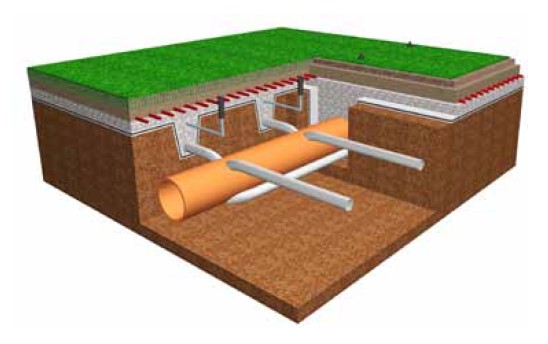 - Дренажная система. Дренаж – это трубы, предназначенные для вывода из почвы излишней влаги за пределы игровой площадки (стадиона). Глубина залегания и расстояние между трубами определяется в соответствии с проектом по результатам проб и измерений.