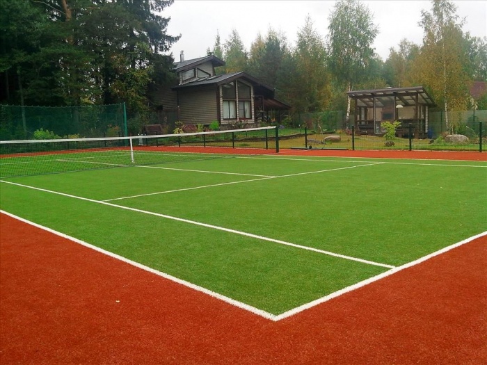 Строительство профессионального корта или индивидуальных площадок значительно упрощается с применением синтетических покрытий. Они являются достойной альтернативой натуральной траве. Обустройство дренажной системы, идентичной грунтовым кортам, повысит качество поля, улучшит его эксплуатационные показатели. Теннисные площадки с искусственным покрытием могут использоваться круглый год. Срок службы у искусственных систем гораздо больше, чем у натурального покрытия. А внешний вид поля сложно отличить от настоящего природного газона.